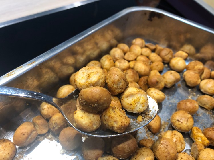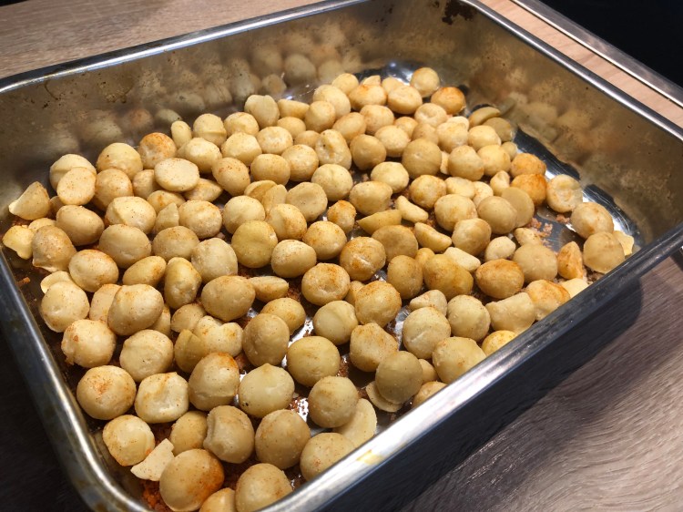 Ich nehme immer pro Packung Macadamias (125g) einen Teelöffel Salz und prise Gewürz.