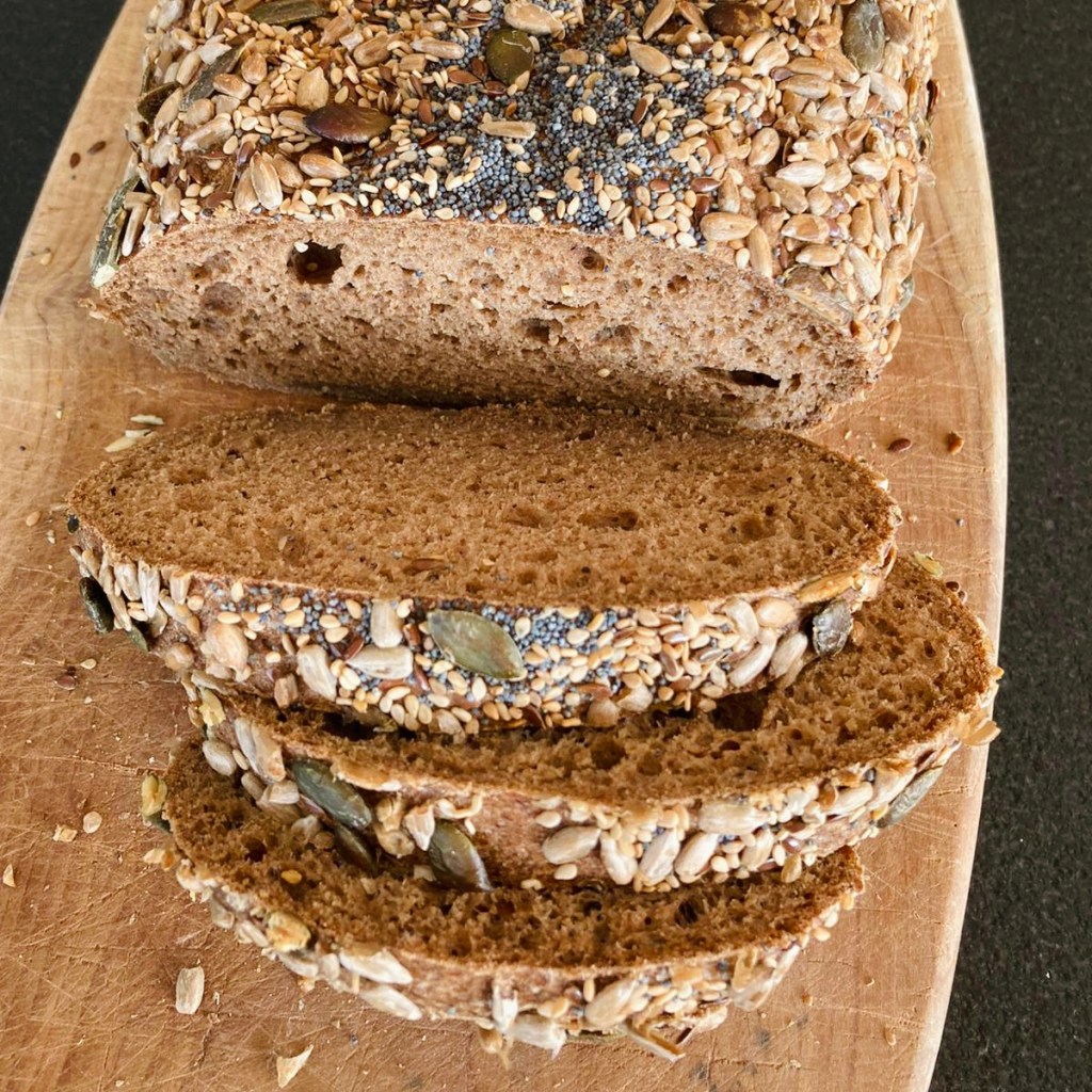 Das Brot auf ein mit Backpapier ausgelegtes Blech legen, mit feuchten Händen formen, mit den Körnen bestreuen und im vorgeheizten Backofen bei 180° C für ca.60min backen.