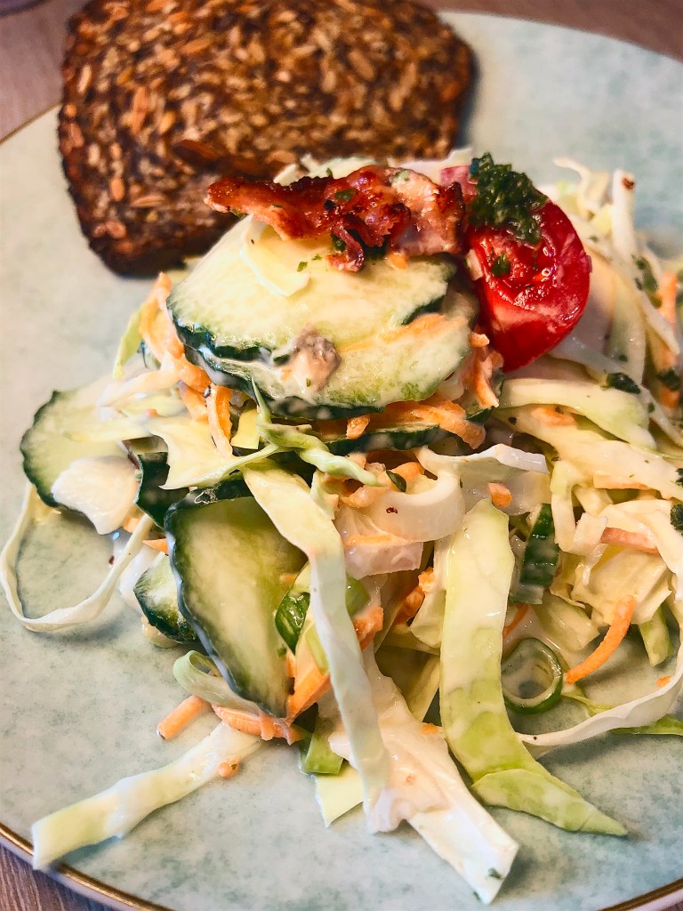 Was mir beim Abschmecken aufgefallen ist, ist dass die Sauce etwas kräftiger gesalzen werden muss, damit dann der Salat genau richtig gesalzen ist.